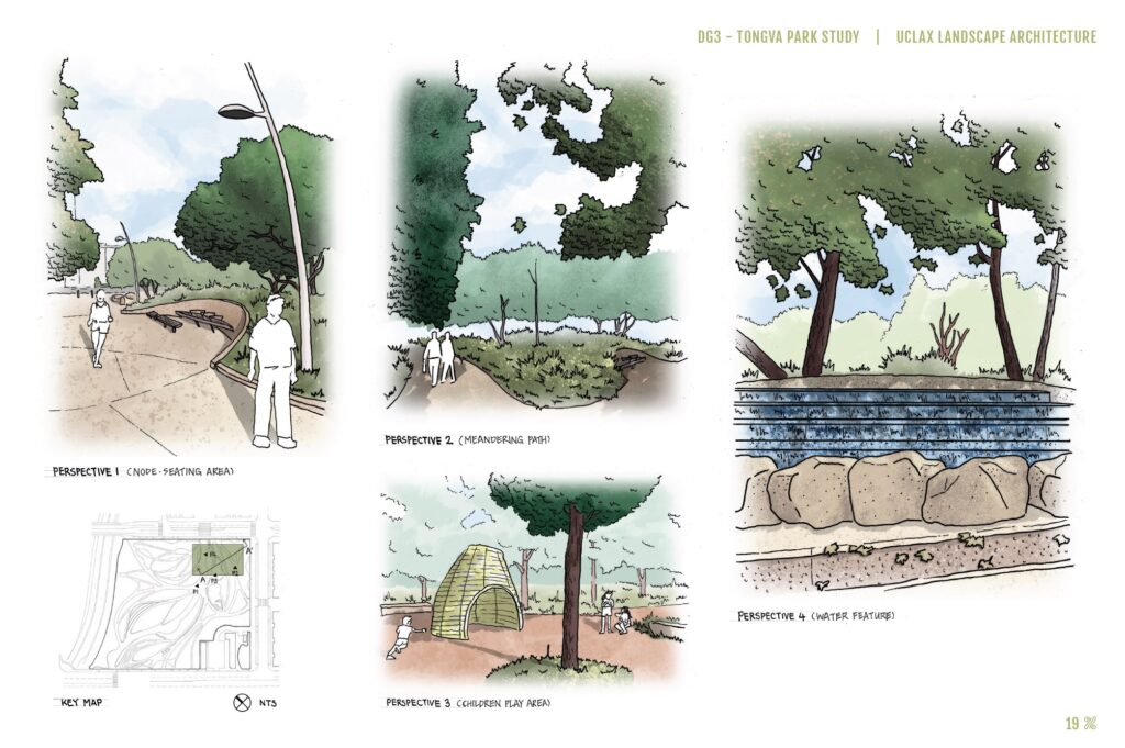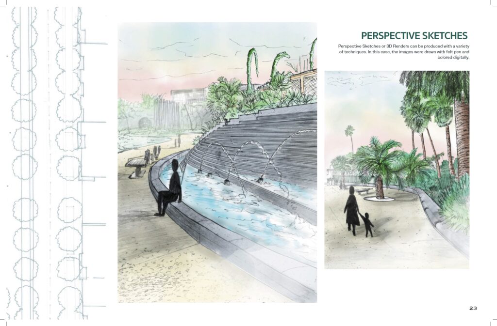 This is the final project for the third and final design graphics course, concluding our in-depth study of Tongva Park with a presentation booklet. This booklet compiles drawings from both Design Graphics 1 and Design Graphics 2 courses, along with hand drawings that were digitally rendered during the Design Graphics 3 course. Students were required to design a presentation booklet using Adobe InDesign that tells the story of their work.