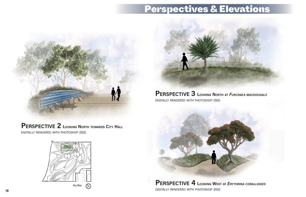 The judges appreciated the WUCOLS addition. The colored plan shows strong definition, and the added plant species are a nice touch. The rendered sections are nicely done. The enlargement is very well done.