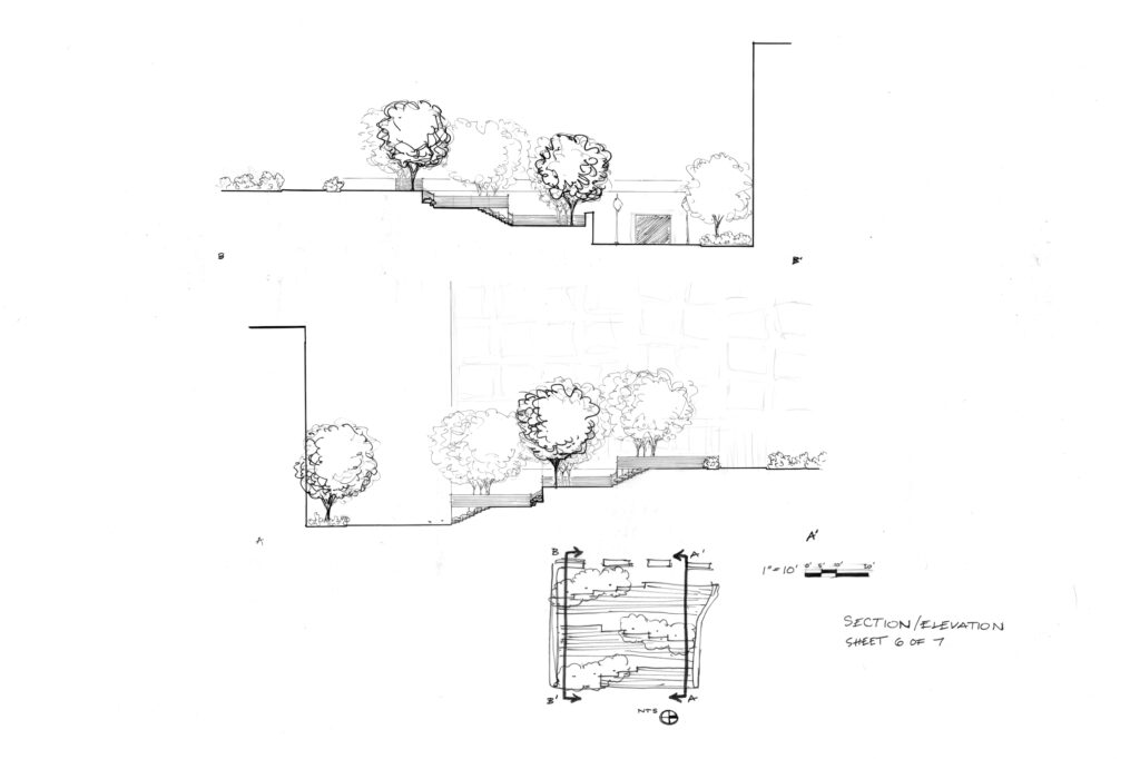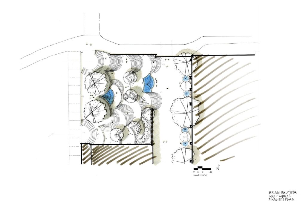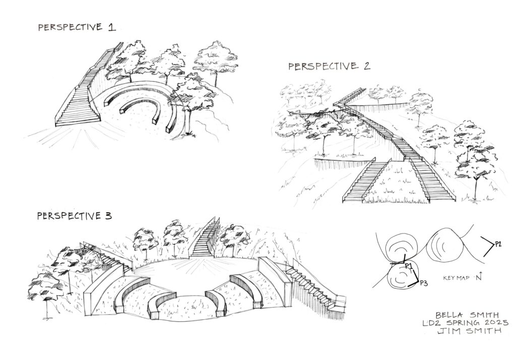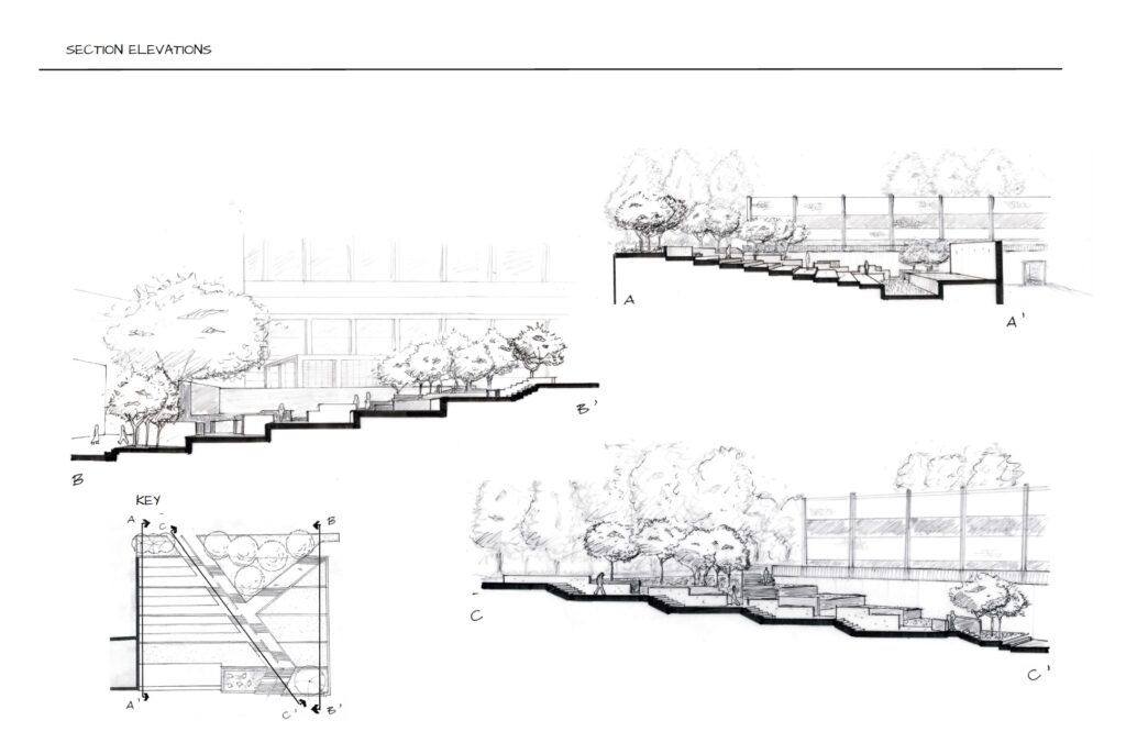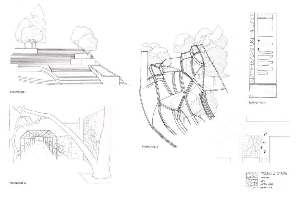 This project reimagined the Melnitz Stairs on the UCLA campus, focusing on how to move people effectively between two major grade changes. The course emphasized developing a clear concept and carrying it through the design process to a final concept plan. My work included a site plan, sectional drawings, and perspective views to illustrate circulation strategies and spatial experiences, showing how the redeveloped stairs could better connect the upper and lower campus areas..