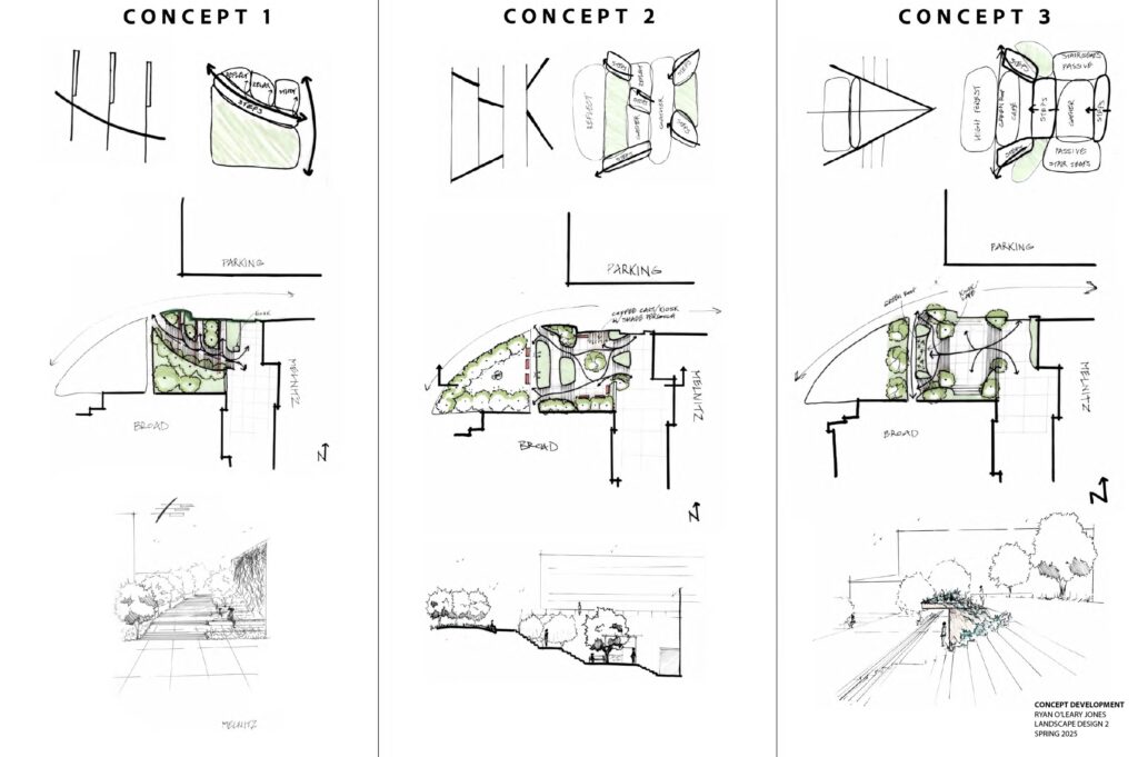 This course introduces the landscape architectural design process. Emphasizing process and concept development, students identify a problem and then use site inventory, analysis, program development, and exploration to test solutions. Projects are small-scale sites—preferably actual and visitable, such as intimate courtyards, street plazas, and pocket parks—and/or physically built (i.e., limited use of computer drafting, rendering, and 3D modeling).