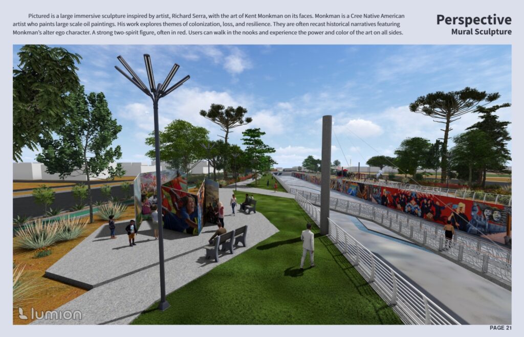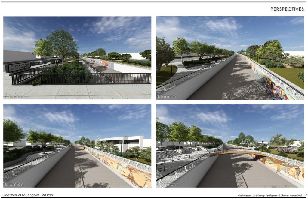 I aimed to create a diverse range of park programming elements to engage and connect the many communities of the San Fernando Valley. This park places a strong emphasis on the existing murals. It blends art, movement, and plant life in a vibrant, contemporary way. The overall design evokes an earthquake fissure, nodding to the area’s tectonic activity while amplifying the symbolic divide created by the canal. Much like Judy Baca’s work, which united communities through public art, this park aspires to bring people from all walks of life together in a shared space to interact, connect, and experience art collectively.