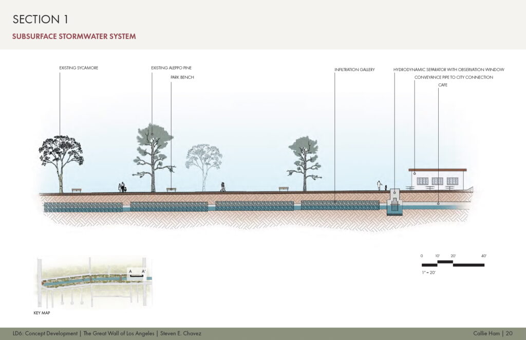 This project was unique in that it was an extremely long, linear, and narrow park, bisected by the gaping Tujunga Wash concrete flood control channel. In other sites, we may have been able to dechannelize the walls to expand the usable site footprint, however the walls of this flood channel are the canvases for the beautiful and significant murals of the Great Wall of Los Angeles, a timeline of Los Angeles history, and therefore needed to be preserved and revered. My design was ultimately inspired by a unique moment floating over the river, where sky and valley meet, which symbolizes the story of the river’s history and stormwater’s journey, while also creating feelings of hope and optimism about the future. I focused my design on emphasizing and recreating more of these moments looking up and down the river channel, while also improving pedestrian safety and increasing onsite stormwater processing.